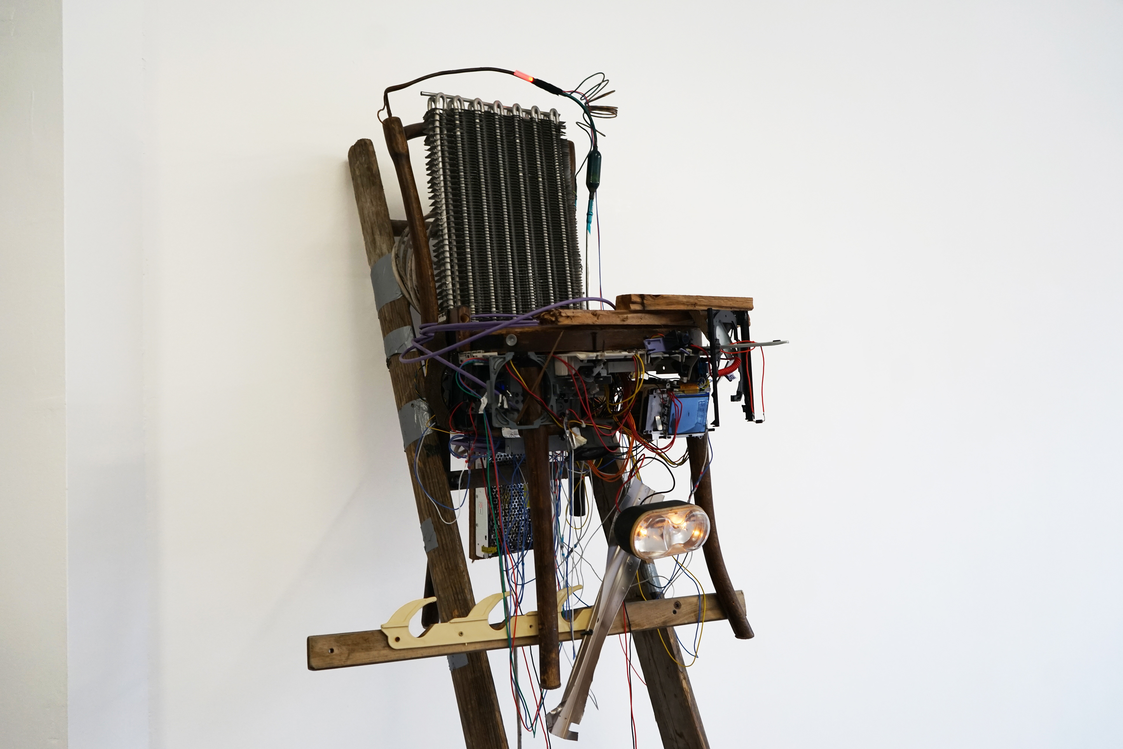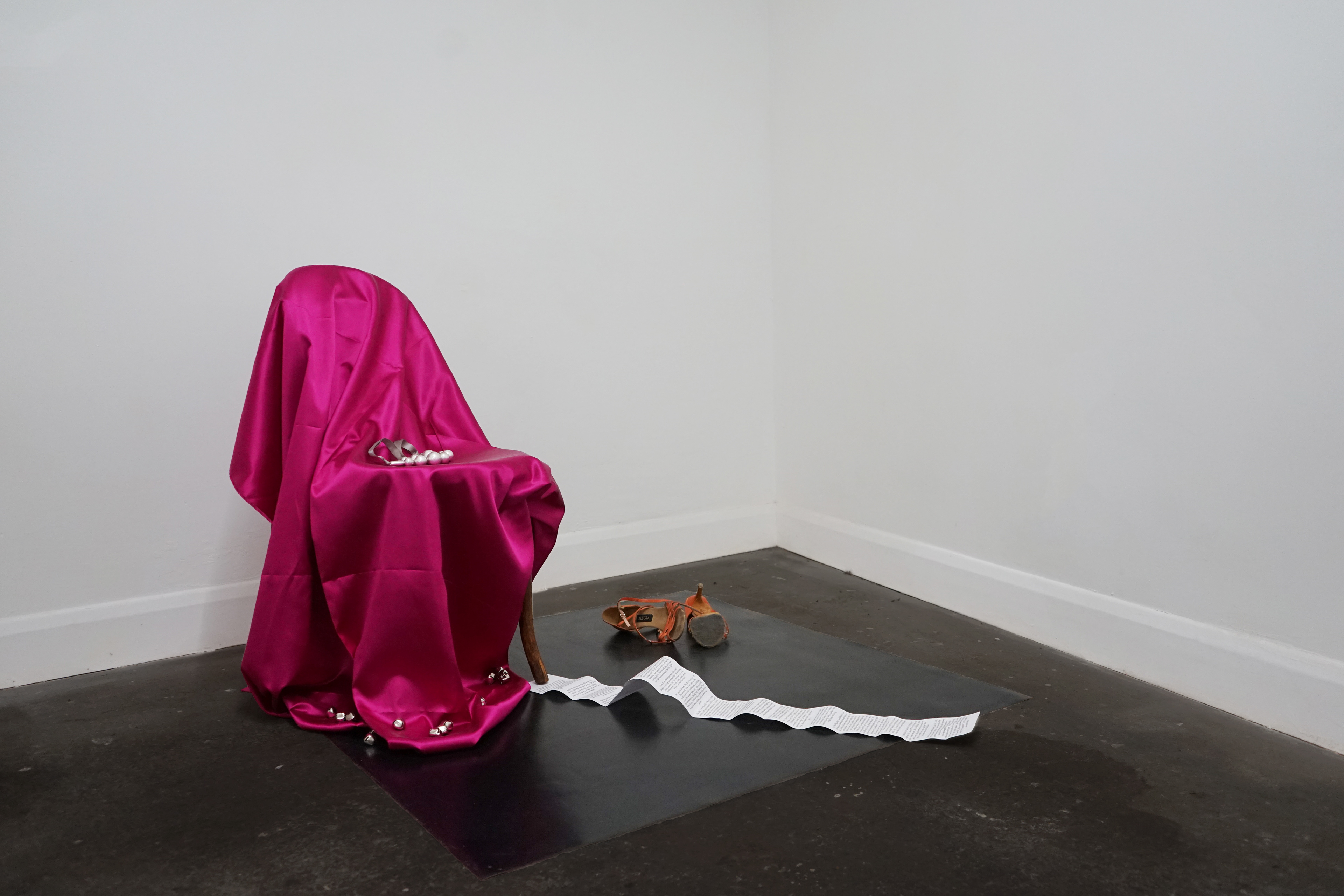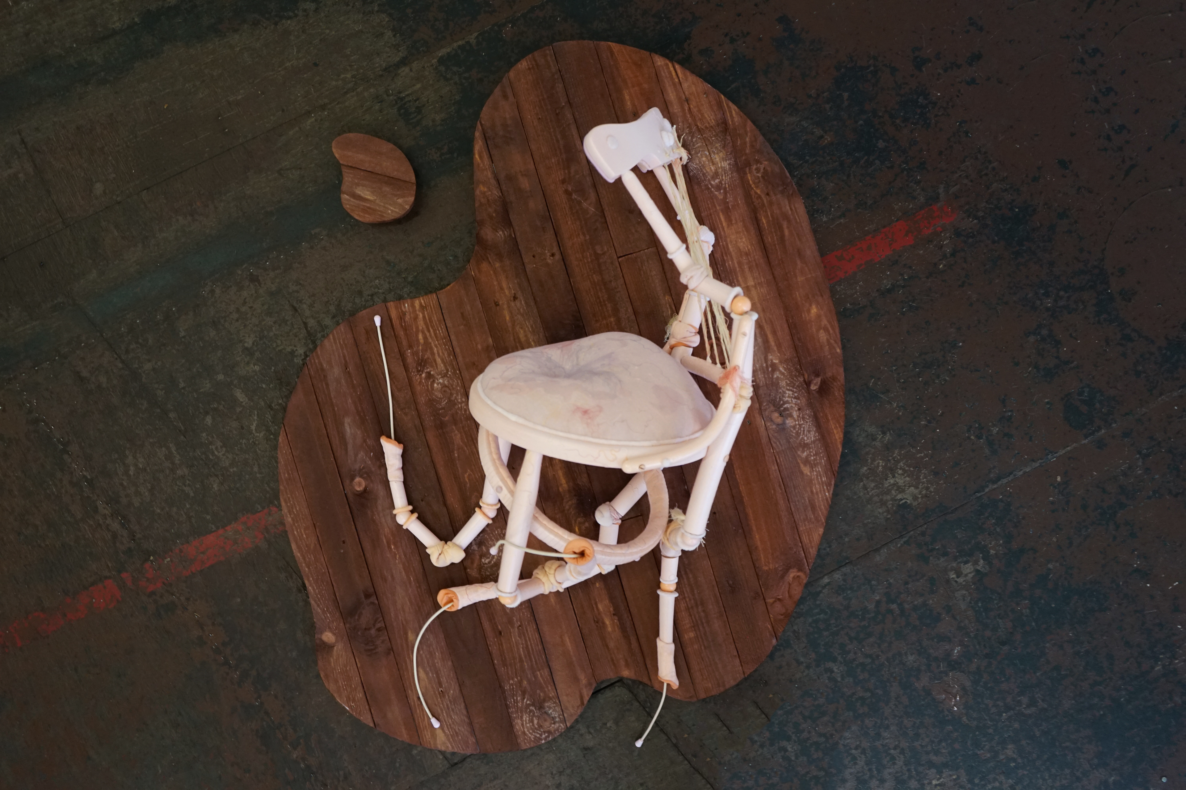 Alterered bent-wood chair, used vinyl marley dance studio flooring, latex, bangles, found text, silk garments, marquetry drill, antique strap clamp,