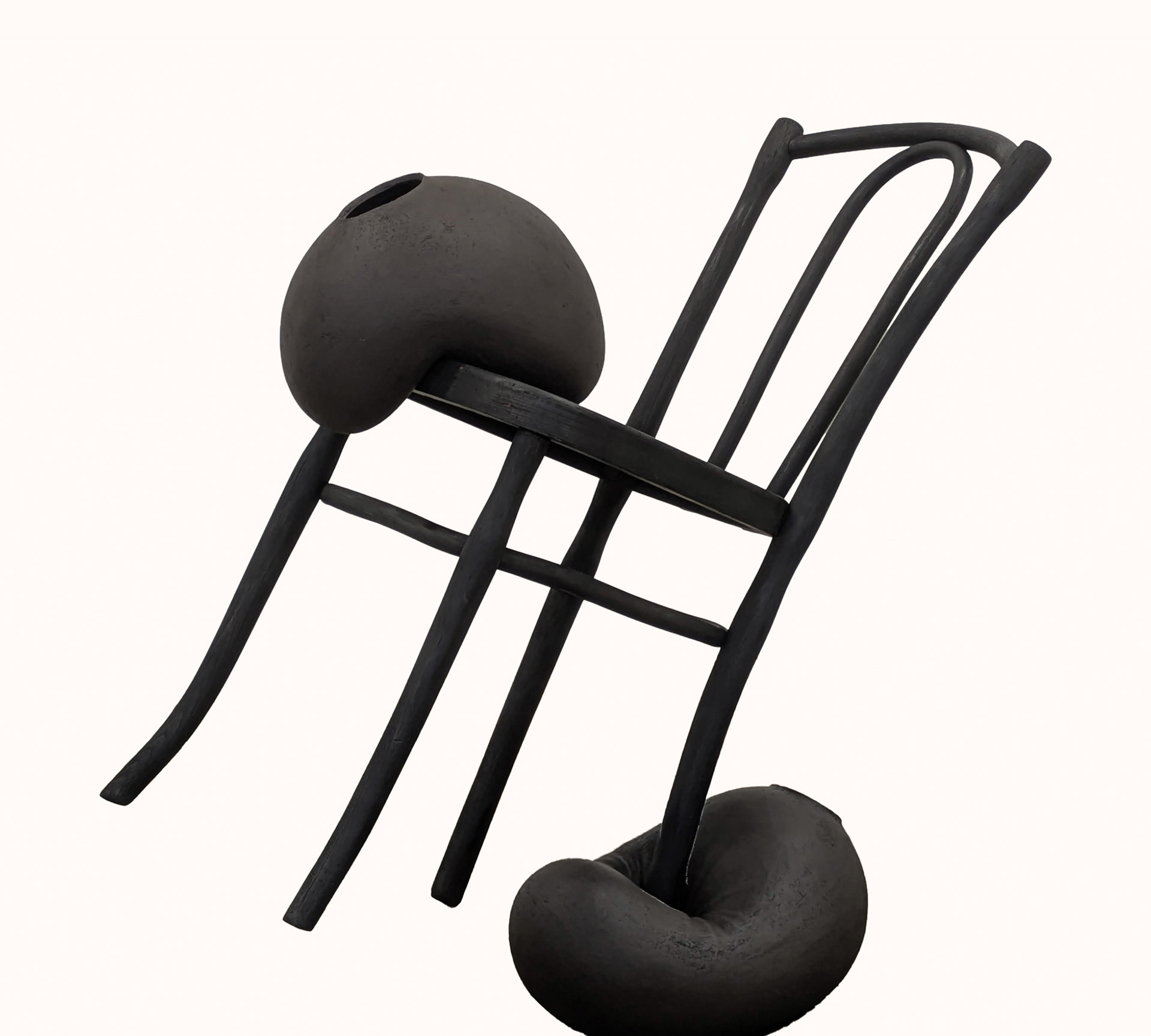 Black stoneware ceramic and charred Bentwood chair,