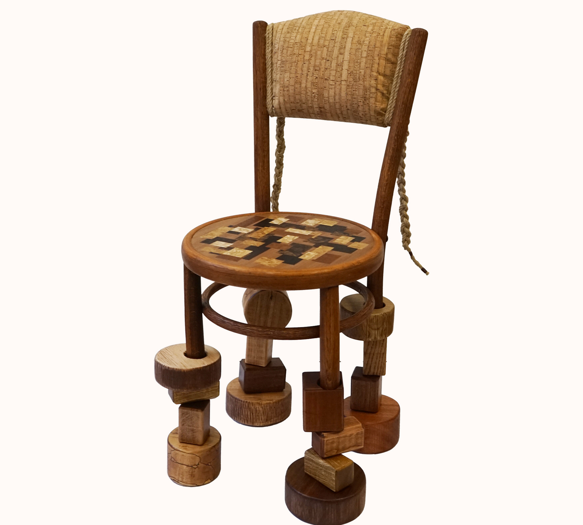 Bentwood chair, hand cut marquetry, cork, jute, various wood species,
