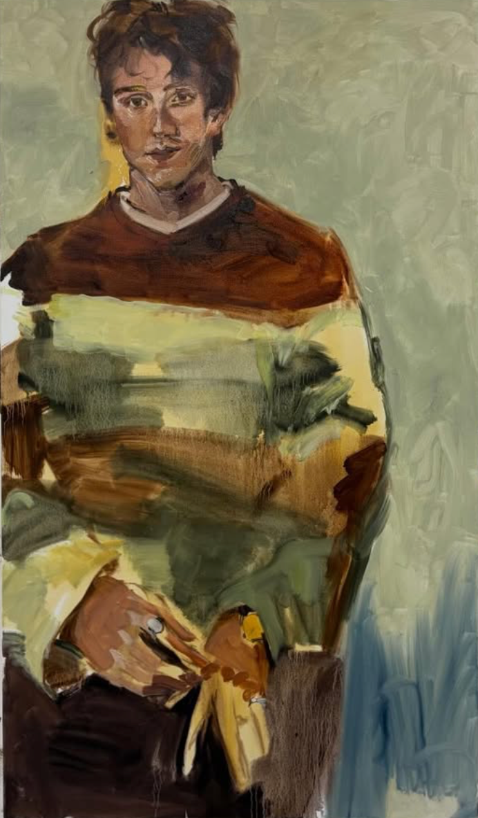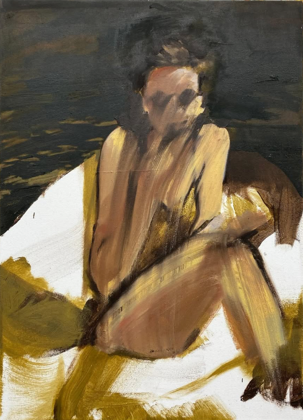 Roque's paintings give prominence to interactions. The way someone’s body looks sculpted against sand or meshed with ragged vs smooth surfaces of river-side rocks. The way somebody’s face looks up to another in an embrace, or down in concentration, or how their head leans on another’s in rest.