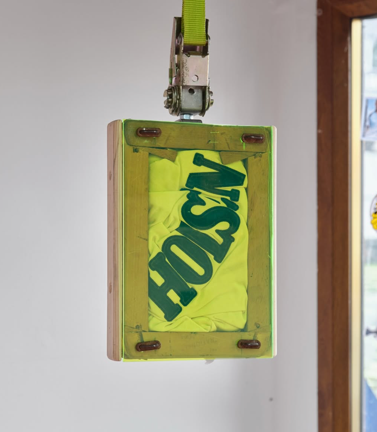 Islington station firehose, paracord, roofing screws, safety lock, rope clamp, key, Los Vegas calling card, ratchet straps, rivets, screw eyelet, heat shrink, metal glue and o-ring on chair.,