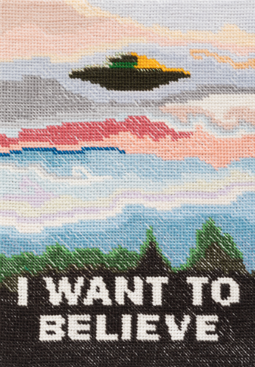 Karen David is a London-based artist and writer whose multidisciplinary practice delves into themes of mysticism, consumerism, and the domestic. Her work incorporates materials and subcultures such as tie-dye, crystals, dreamcatchers, and references to The X-Files, using them as aesthetic shorthand for New Age and paranormal ideas. This approach creates a space that oscillates between cynicism and sincerity, allowing for experimentation, magic, mythmaking, and the generation of new meanings.